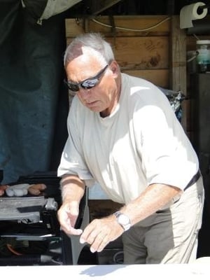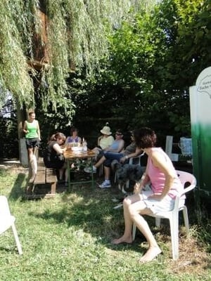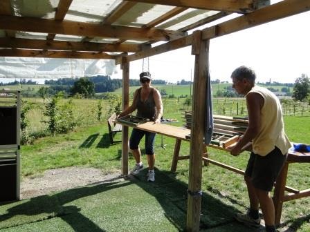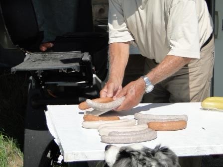 Willi, ab an den Grill ! Der Tisch und die Bänke wurden unter den Baum in den Schatten gestellt.
